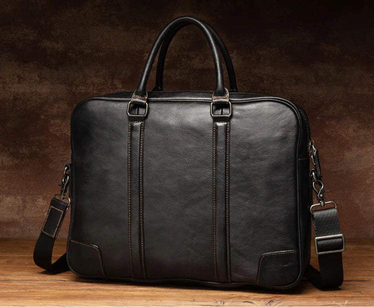 This is a classic design made with selected genuine cow leather, which the leather is very thick and top quality. It can be carried as a everyday bag for men perfectly. The bag can be fit for a 15.6'' inches laptop very well, also there are many pockets inside of the bag, which can make your everything in organization.